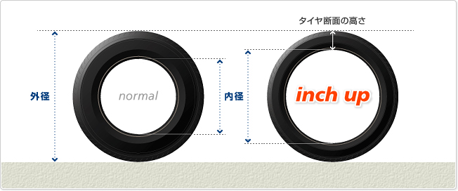 上図のように、タイヤの外径は変わらず、内径(インチサイズ)だけが大きくなっているのがわかると思います。これが俗に言うインチ(サイズ)アップになります。